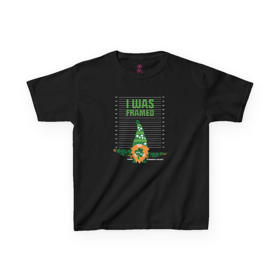 Funny 'I Was Framed' T-Shirt for Kids showing a Leprechaun's mugshot and charges. Perfect for a playful and lighthearted vibe, suitable for kids with a sense of humor. Ideal for St. Patrick's Day celebrations or any casual day wear.