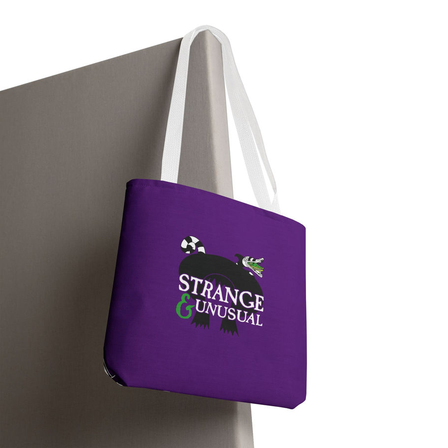 Step into the world of the strange and unusual with this bold Beetlejuice-inspired tote bag. Featuring a striking purple front design with the iconic quote “Strange & Unusual” framed by a creepy-cute sandworm illustration, this bag is perfect for fans of Tim Burton’s cult classic. Flip it over and you’ll find bold black-and-white stripes—reminiscent of Beetlejuice’s famous suit—complete with a mischievous sandworm detail for extra spooky flair.