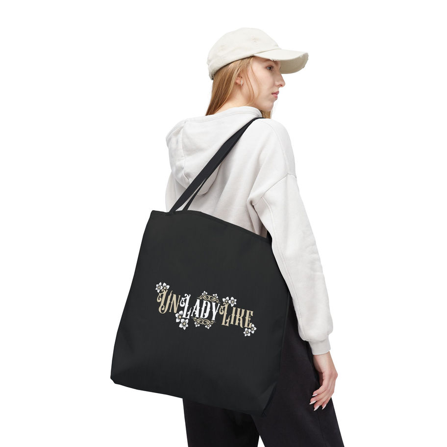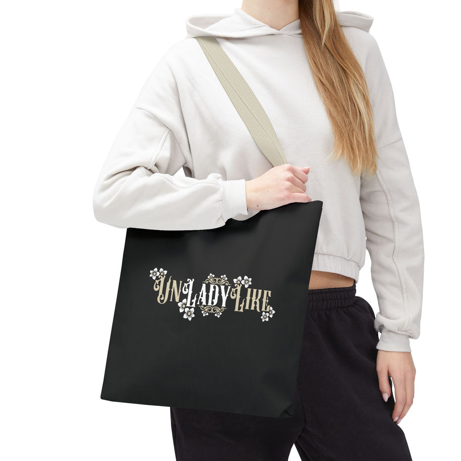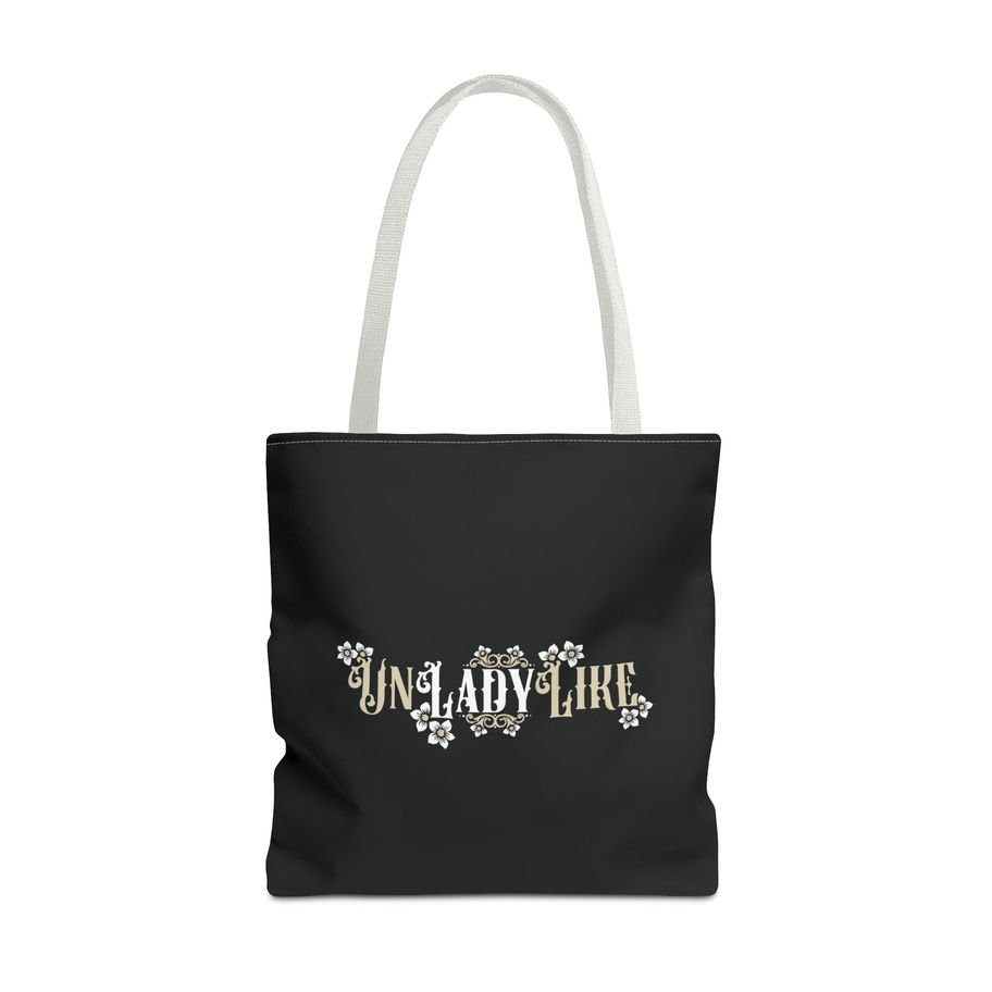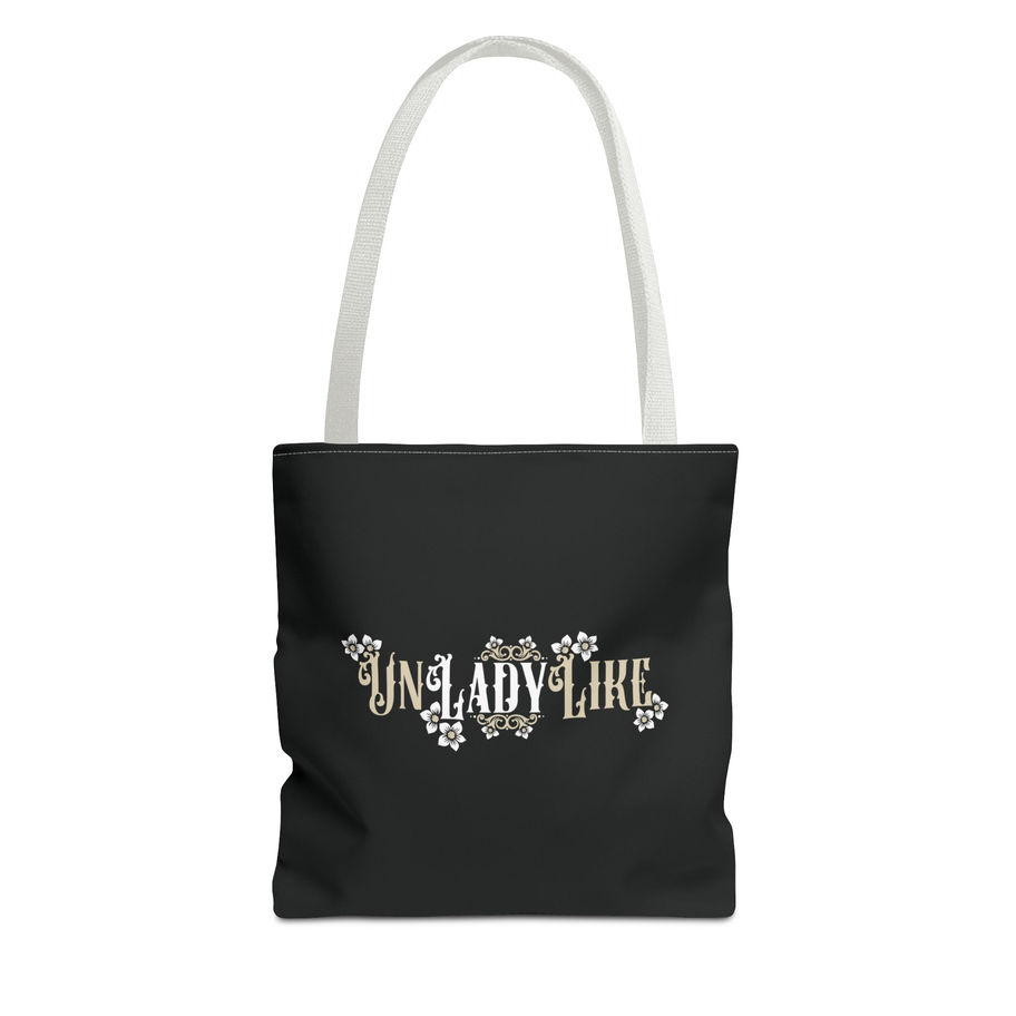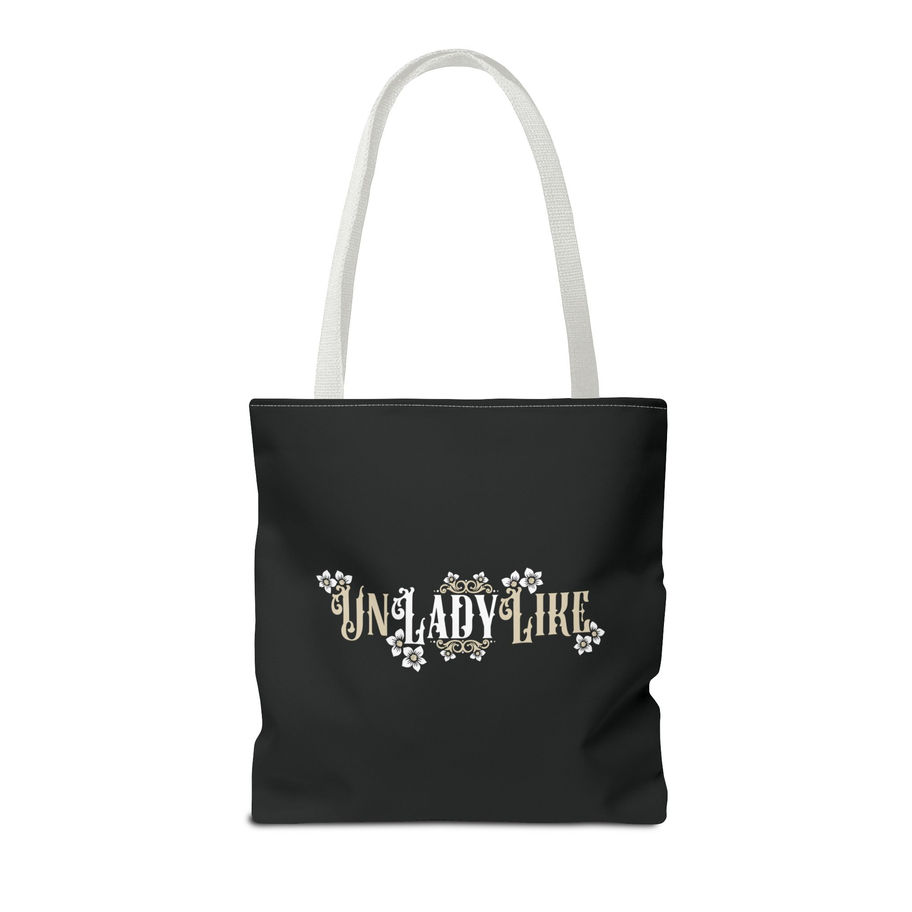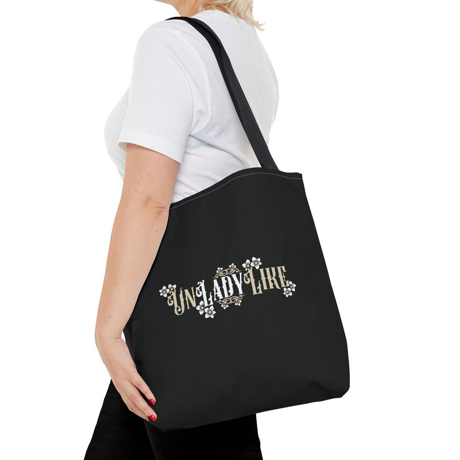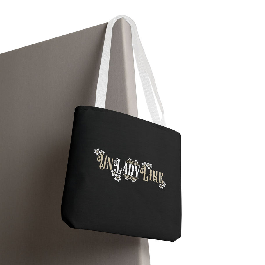 A stylish and bold tote bag featuring a black, white, and tan Victorian script design of “UnLadyLike” with frame elements and flowers. This tote bag exudes a vintage and sophisticated vibe, perfect for the fashionable and independent woman looking to make a statement. Ideal for everyday use, shopping, or as a fashion accessory. Great for those who appreciate unique and elegant designs. Perfect for birthdays, Mother's Day, or just to treat yourself.