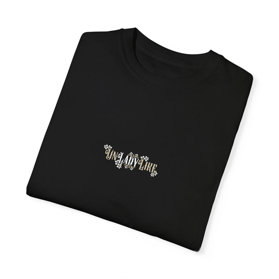 This T-shirt features the word 'Unladylike' in Victorian script with framing and flowers, giving off a rebellious yet elegant vibe. Perfect for those who appreciate a mix of vintage and modern styles. Ideal for individuals who enjoy standing out and making a statement. Great for gifts on occasions like International Women's Day or Women's History Month.